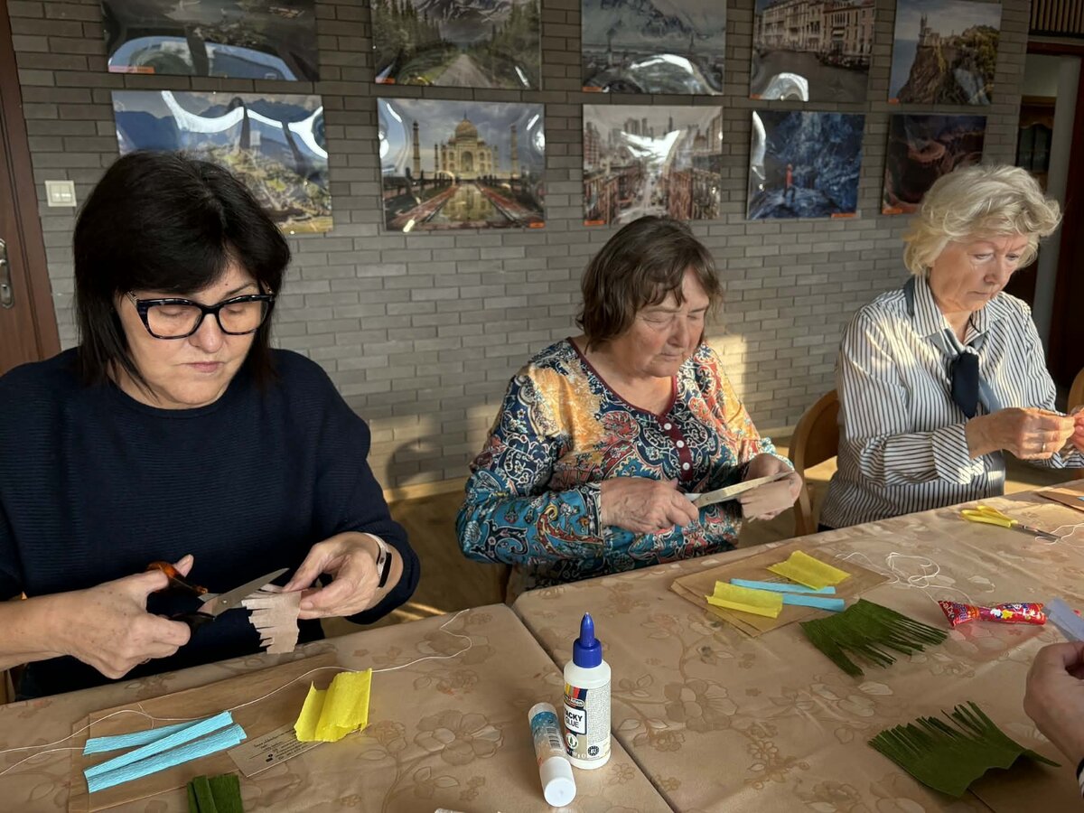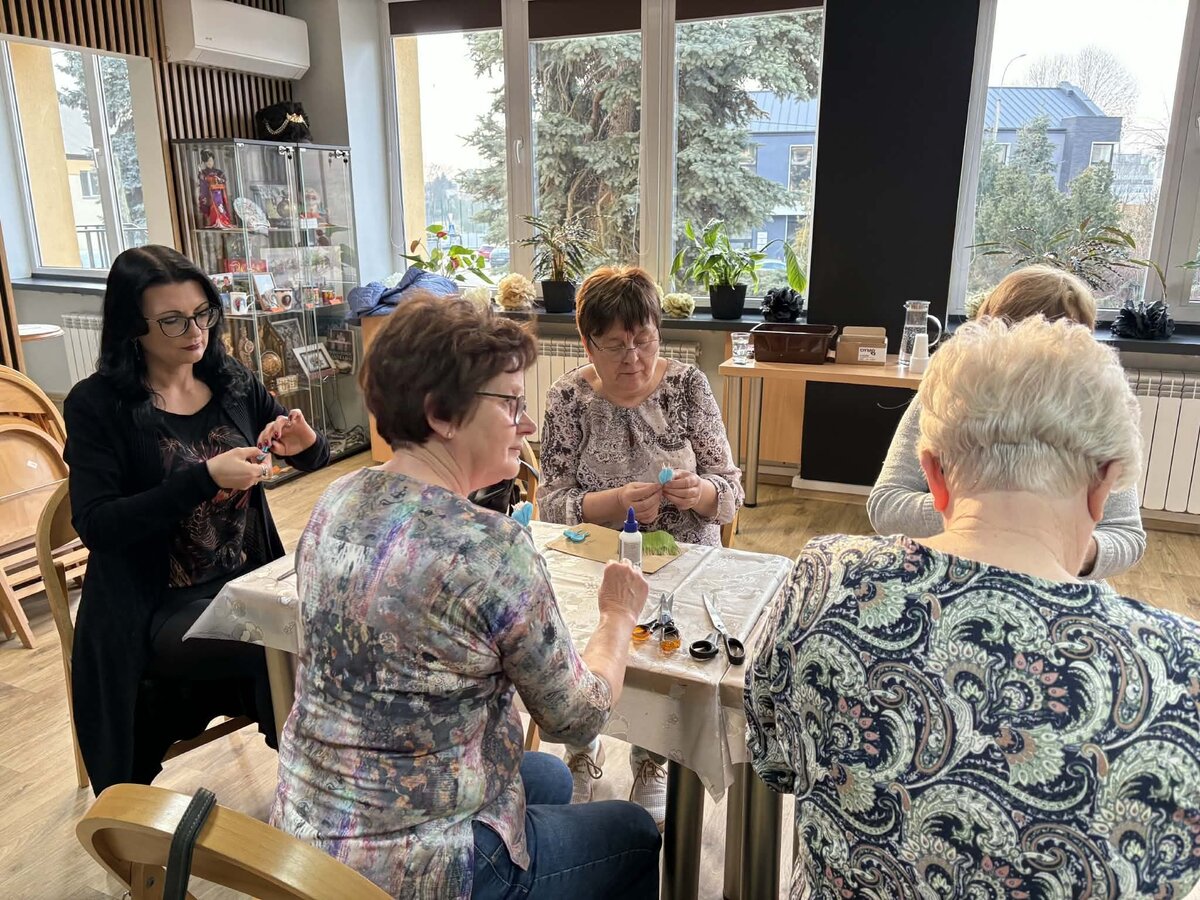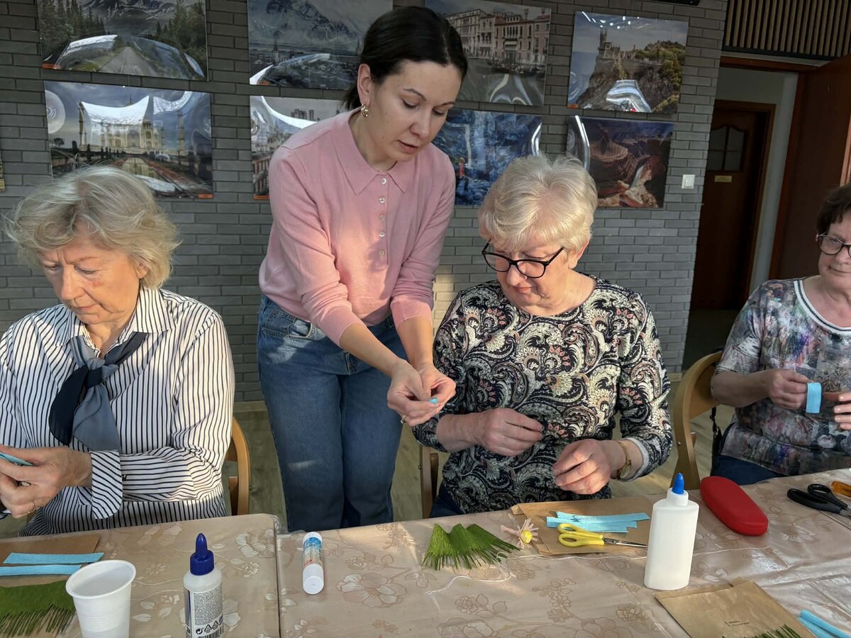 Wczorajsze zajęcia zorganizowane z okazji Dnia Kobiet upłynęły pod hasłem „Wiosenne kwiaty z krepiny i bibuły”. Pod czujnym okiem pani Joanny Kaźmierczak–Kowalskiej z Pracownia Folkowo uczestniczki nauczyły się odpowiednio formować płatki, skręcać i modelować łodygi oraz łączyć poszczególne części tak, by powstała gotowa dekoracja. Prowadząca przedstawiła także podstawowe techniki pracy z krepiną i bibułą oraz przykłady na wykonanie różnego rodzaju ozdób świątecznych za pomocą tych materiałów.