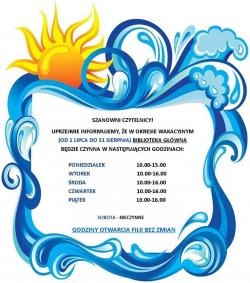 Przypominamy, że w okresie wakacyjnym nasza książnica jest czynna w poniedziałki od 10.00 do 15.00, a w pozostałe dni tygodnia od 10.00 do 16.00. Zapraszamy!