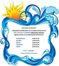 Uprzejmie informujemy, że w okresie wakacyjnym (od 1 lipca do 31 sierpnia 2021 r. Biblioteka Główna będzie czynna w następujących godzinach: