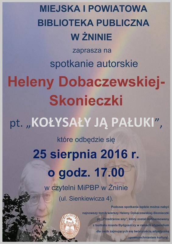 25 sierpnia 2016 r. w naszej bibliotece odbyło się jubileuszowe spotkanie autorskie Heleny Dobaczewskiej-Skonieczki - żninianki, która 40 lat temu wyruszyła z rodzinnego miasta w świat, aby po latach stwierdzić, że warto kochać swoje Małe Ojczyzny i do nich powracać. -