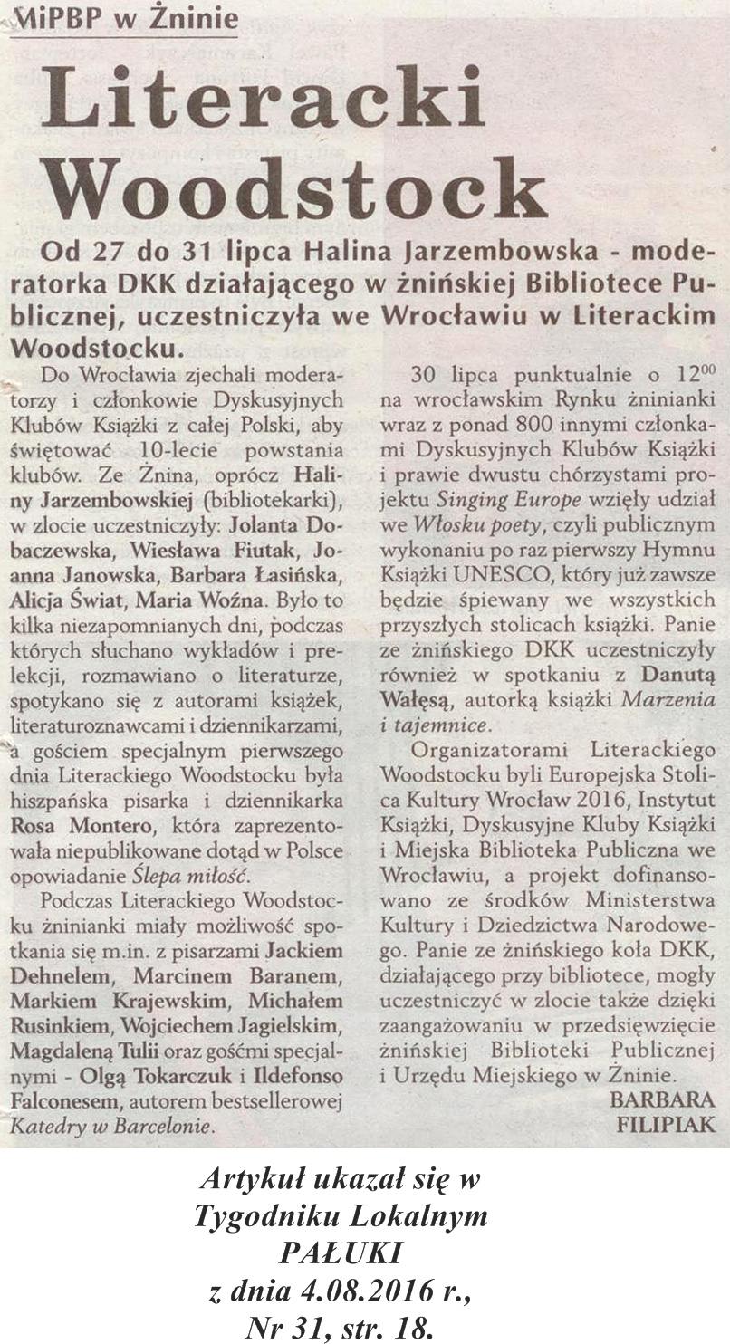 W dniach od 27 do 31 lip[ca 2016 r. panie z Dyskusyjnego Klubu Książki działającego w Miejskiej i Powiatowej Bibliotece Publicznej w Żninie uczestniczyły w Literackim Woodstocku. Artykuł z tego wydarzenia poniżej. -