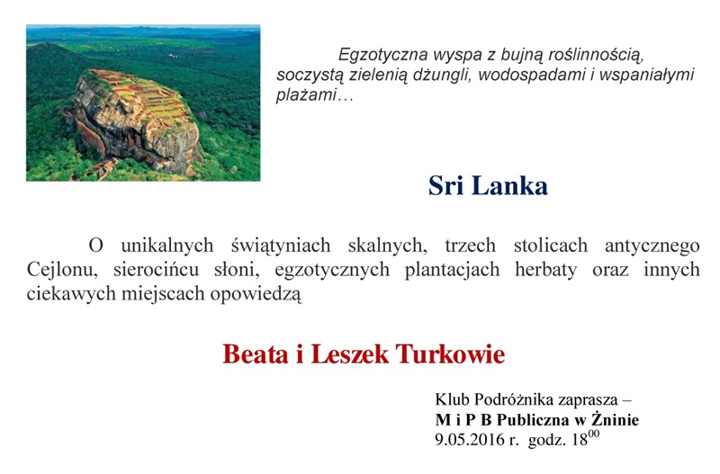 9 maja 2016 r. o 18.00 zapraszamy na kolejne spotkanie Klubu Podróżnika. Tym razem na Sri Lankę zabiorą nas Beata i Leszek Turkowie. -