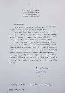 W związku z zakończeniem inwestycji polegającej na przebudowie biblioteki głównej i montażu windy dla osób niepełnosprawnych zrealizowanej w ramach Narodowego Programu Rozwoju Czytelnictwa Priorytet 2 Infrastruktura bibliotek 2016 - 2020, Wiceprezes Rady Ministrów, a jednocześnie Minister Kultury i Dziedzictwa Narodowego prof. Piotr Gliński na ręce Jadwigi Jelinek - dyrektora naszej biblioteki, wystosował list gratulacyjny, z którym w całości mogą się państwo zapoznać poniżej. Także gratulacje przesłał Dariusz Jaworski - Dyrektor Instytutu Książki, który wierzy, że dzięki zrealizowanej inwestycji i prowadzonym działaniom przez bibliotekę jest ona miejscem ważnym dla lokalnej społeczności. Jego list także prezentujemy poniżej.