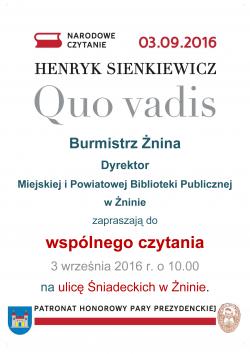 W najbliższą sobotę 3 września 2016 r. o 10.00 na ulicy Śniadeckich w Żninie będziemy uczestniczyć w Narodowym Czytaniu. Zapraszamy mieszkańców Żnina do udziału w tym przedsięwzięciu.