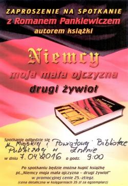 7 kwietnia 2016 r. o 9:00 zapraszamy na spotkanie z Romanem Pankiewiczem, który opowie o książce "Niemcy moja mała ojczyzna. Trzeci żywioł".