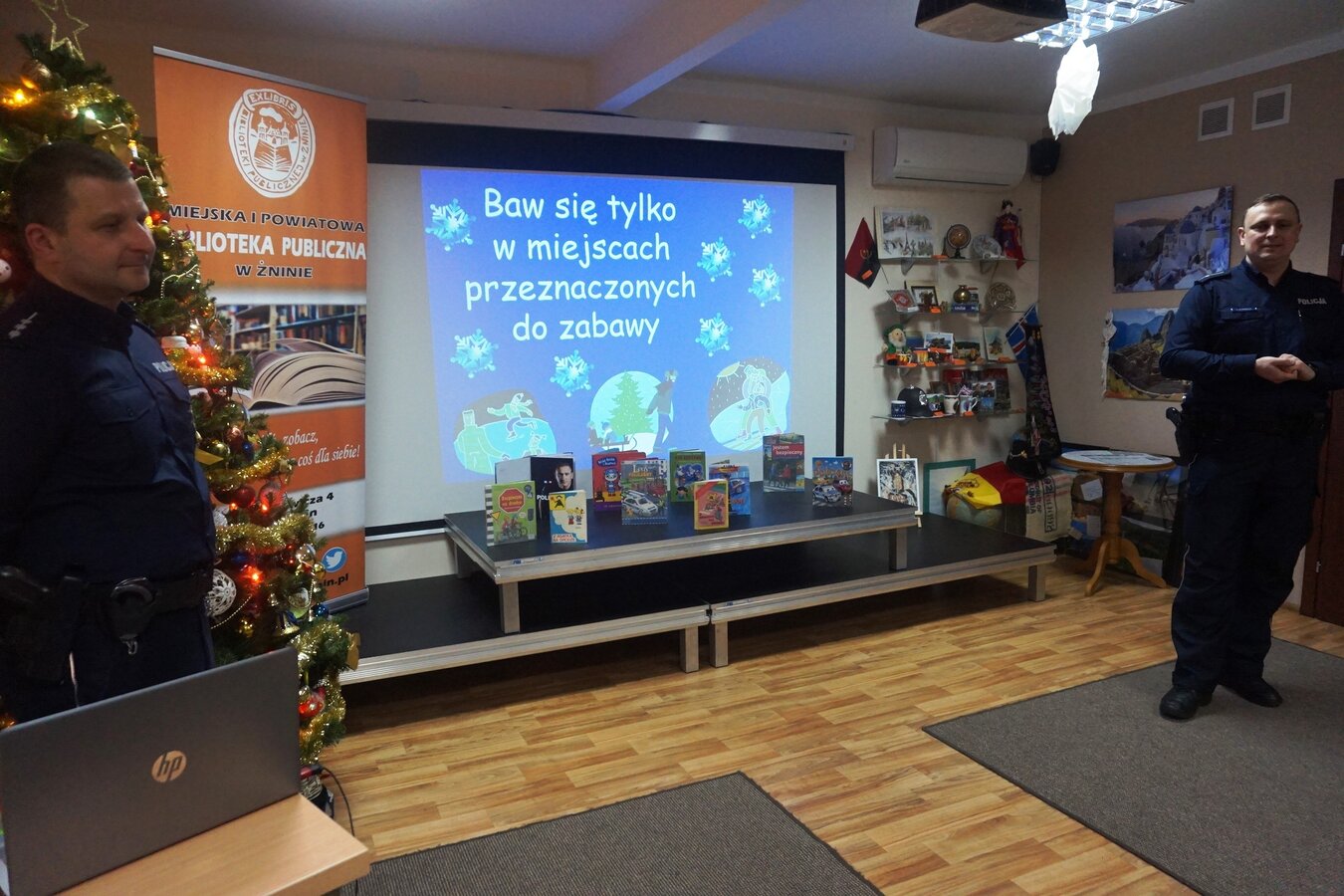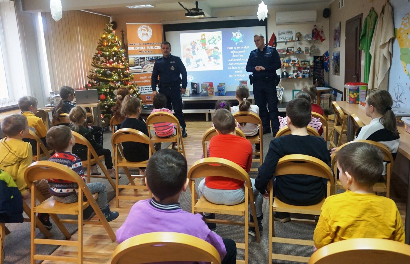 Za nami drugi dzień zajęć feryjnych w bibliotece. Dzisiaj (22 stycznia) odwiedzili nas policjanci z Komendy Powiatowej Policji w Żninie mł. asp. Adam Czarnecki oraz st. asp. Michał Starczewski.