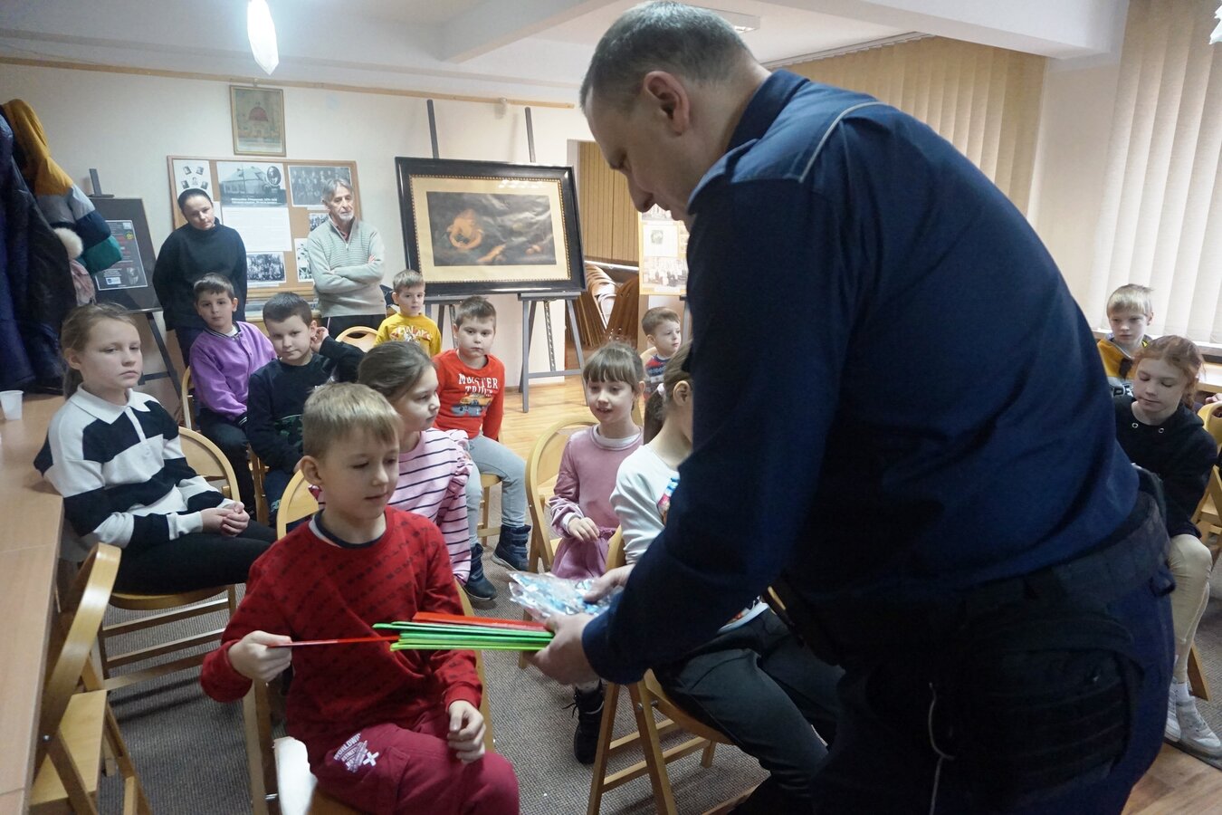 Panowie policjanci przekazali dużo ważnych informacji i wskazówek jak bezpiecznie spędzić ferie. Dzieci z uwagą i zainteresowaniem wysłuchały przygotowanej prezentacji. Następnie uczestnicy mieli okazje zadać pytania naszym gościom.