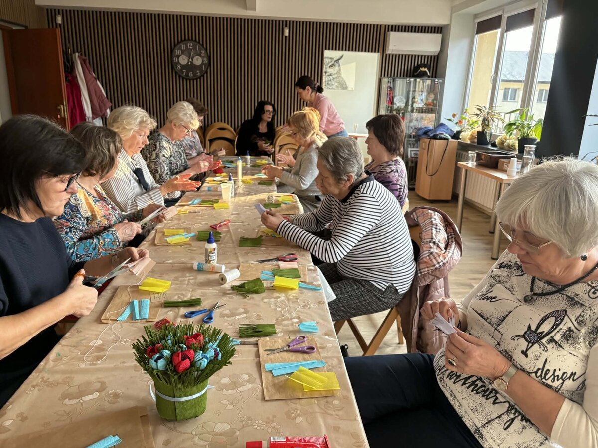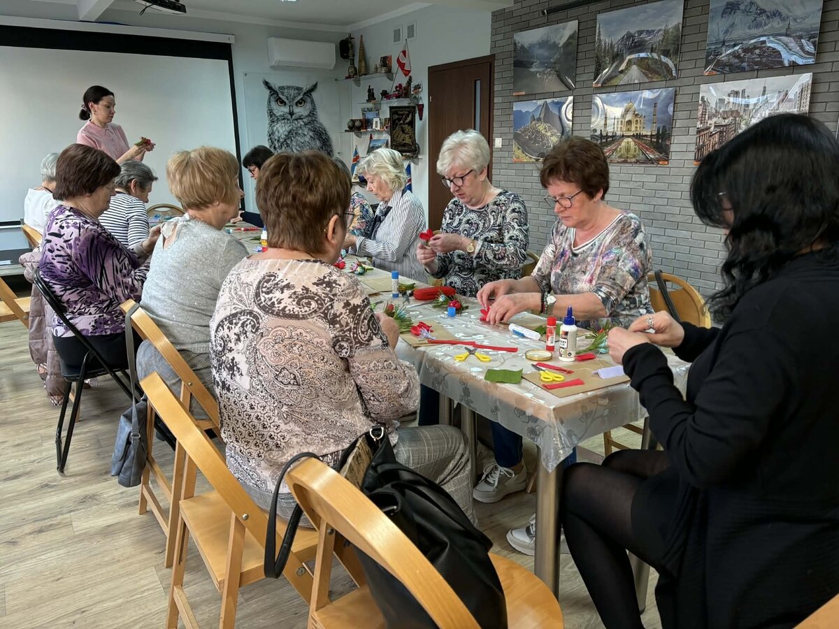 Wczorajsze zajęcia zorganizowane z okazji Dnia Kobiet upłynęły pod hasłem „Wiosenne kwiaty z krepiny i bibuły”. Pod czujnym okiem pani Joanny Kaźmierczak–Kowalskiej z Pracownia Folkowo uczestniczki nauczyły się odpowiednio formować płatki, skręcać i modelować łodygi oraz łączyć poszczególne części tak, by powstała gotowa dekoracja. Prowadząca przedstawiła także podstawowe techniki pracy z krepiną i bibułą oraz przykłady na wykonanie różnego rodzaju ozdób świątecznych za pomocą tych materiałów.