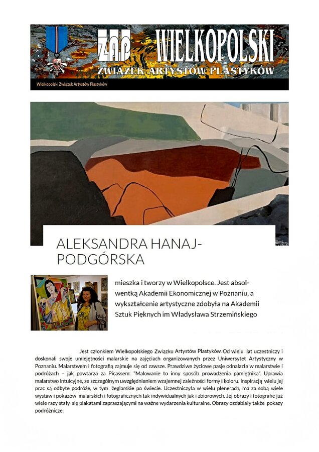 Z wielką przyjemnością chcemy zaprosić Państwa na wernisaż wystawy malarstwa Aleksandry Hanaj-Podgórskiej, członkini Wielkopolskiego Związku Artystów Plastyków. Artystka ma za sobą wiele wystaw i pokazów malarskich oraz fotograficznych, a jej obrazy ozdabiały m.in. pokazy podróżnicze.