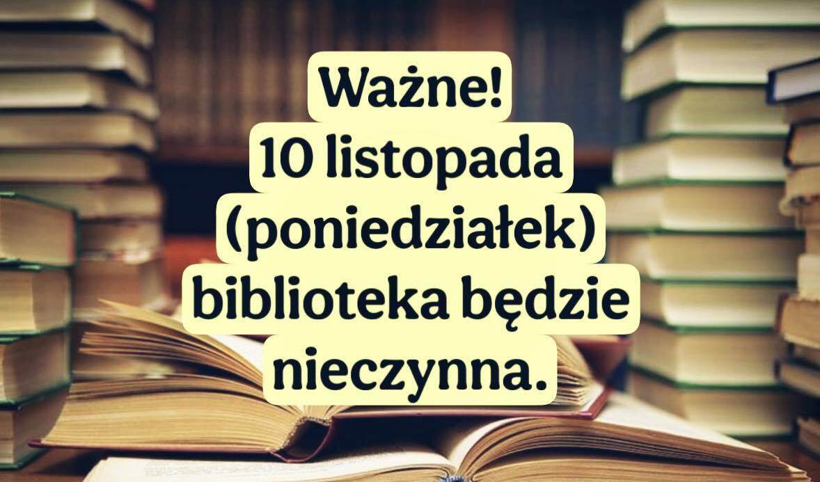 10 listopada (poniedziałek) biblioteka będzie nieczynna. Za utrudnienia przepraszamy.