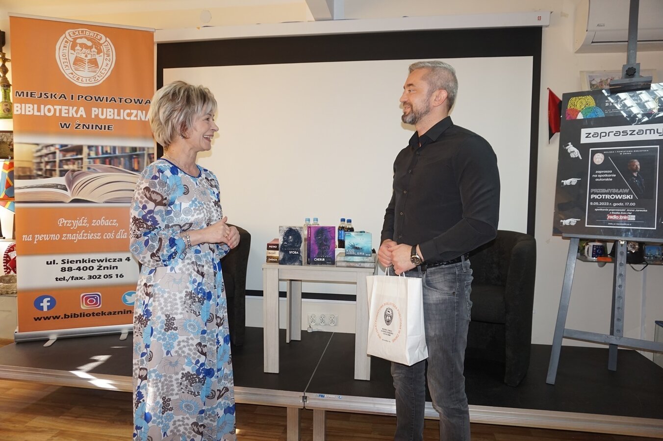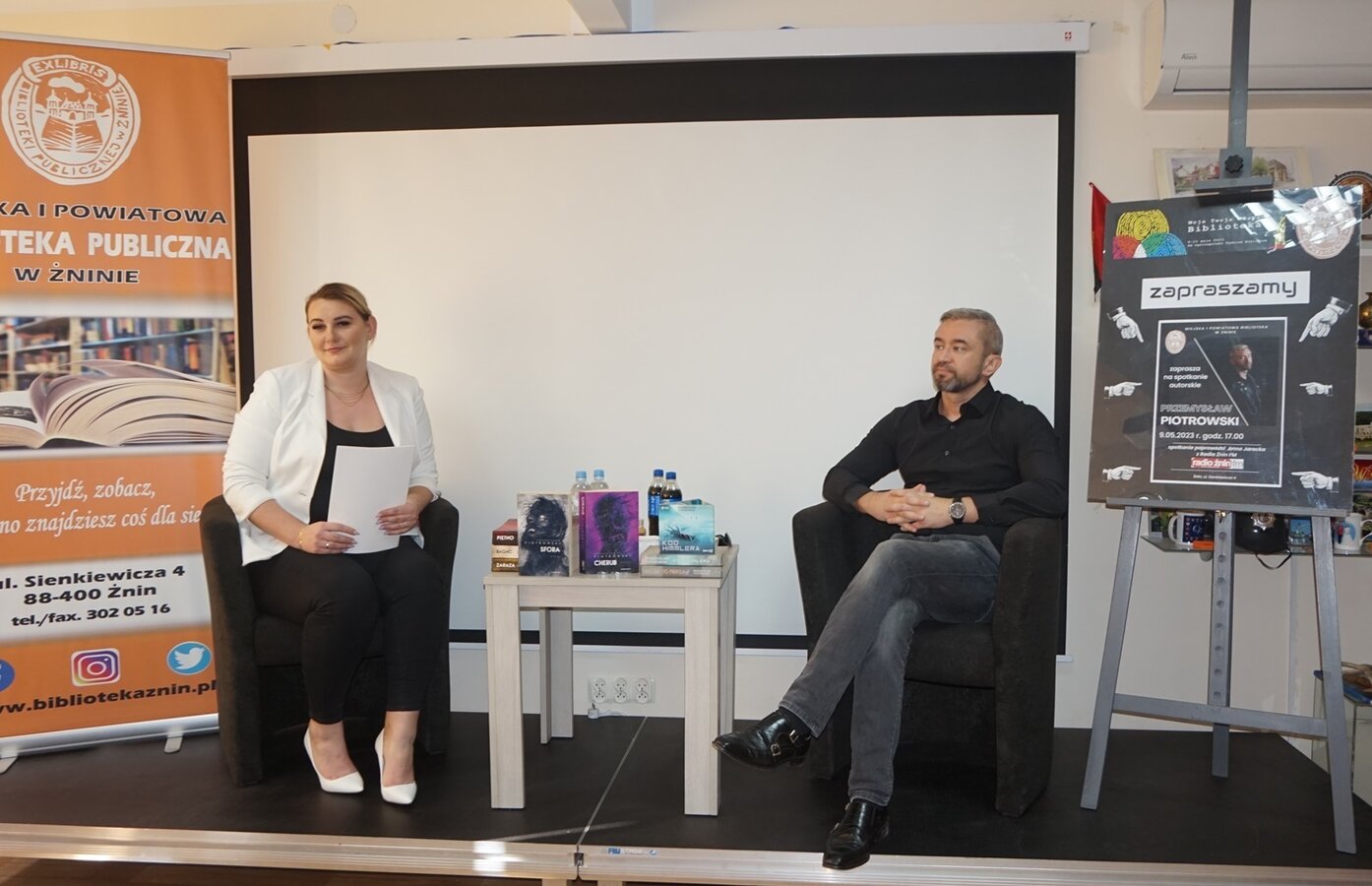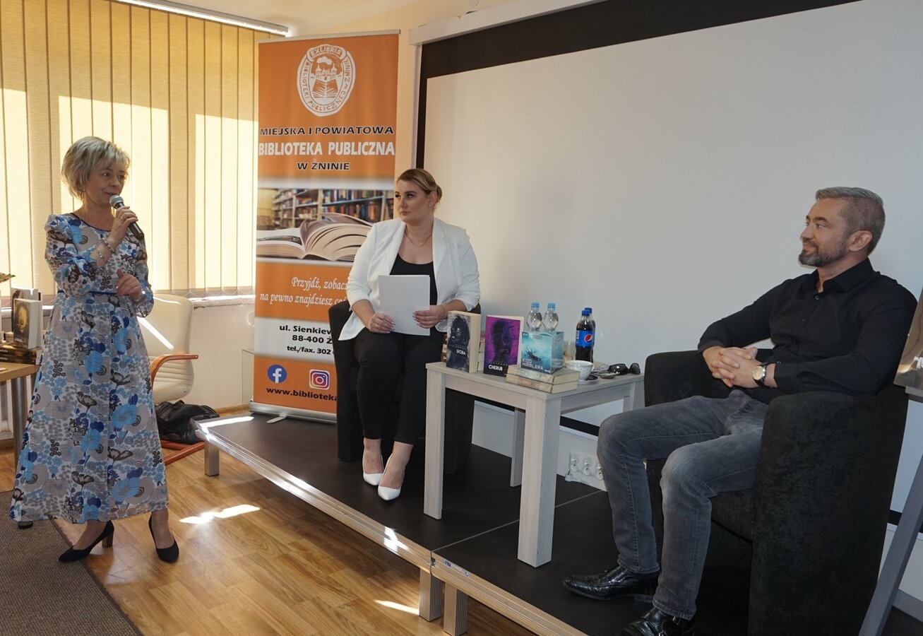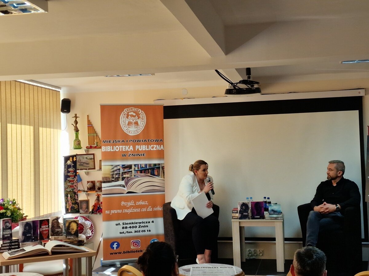 Pierwsze w powiecie żnińskim spotkanie z MISTRZEM POWIEŚCI KRYMINALNYCH odbyło się 9 maja 2023 r. o godz. 17.00 w Miejskiej i Powiatowej Bibliotece Publicznej w Żninie. Poprowadziła je pani Anna Jarecka z Radia Żnin FM.