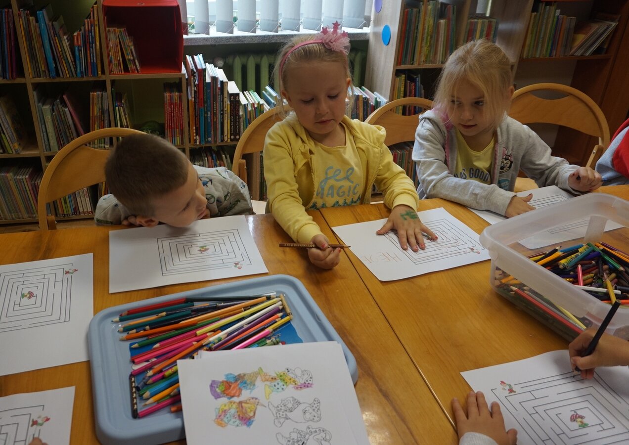 Nie mogło zabraknąć zabawy do piosenki ,,My jesteśmy krasnoludki”. Ostatnim zadaniem przedszkolaków było znalezienie drogi w labiryncie, którą zgubił jeden z krasnali podczas powrotu do swojego domku. Dzięki ,,Jeżykom” zguba odnalazła drogę i spotkała się z pozostałymi krasnoludkami.