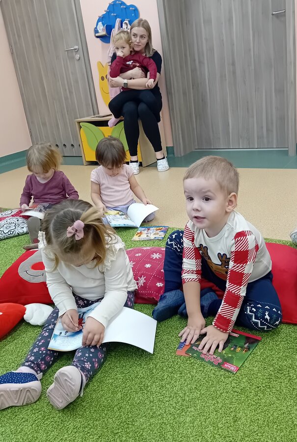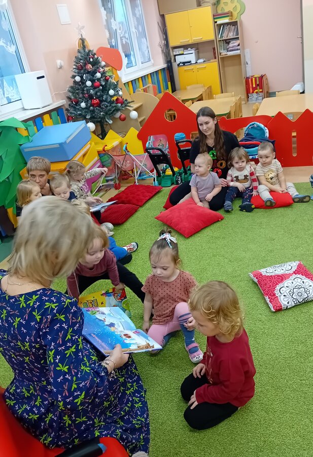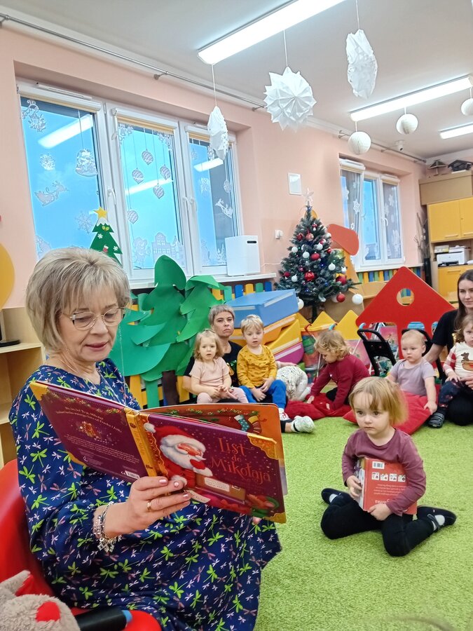 Maluchy wysłuchały świątecznych bajeczek czytanych przez panią Dyrektor Beatę Czaczyk i panią Ewę z Oddziału dla Dzieci. Dzieci wysłuchały z wielką uwagą i skupieniem opowieści o Mikołaju, choince, Świętach Bożego Narodzenia, zimie. Nie zabrakło śpiewania świątecznych piosenek.