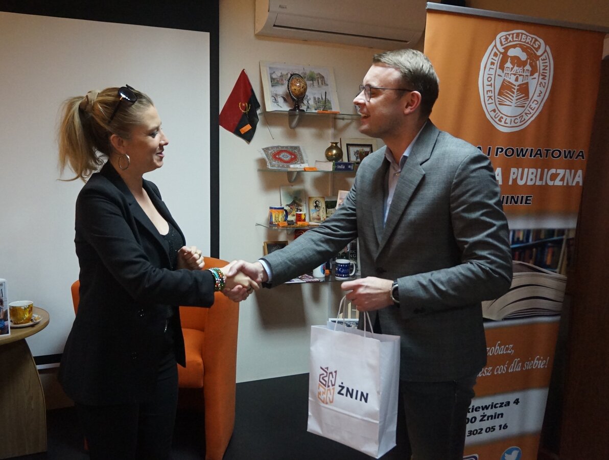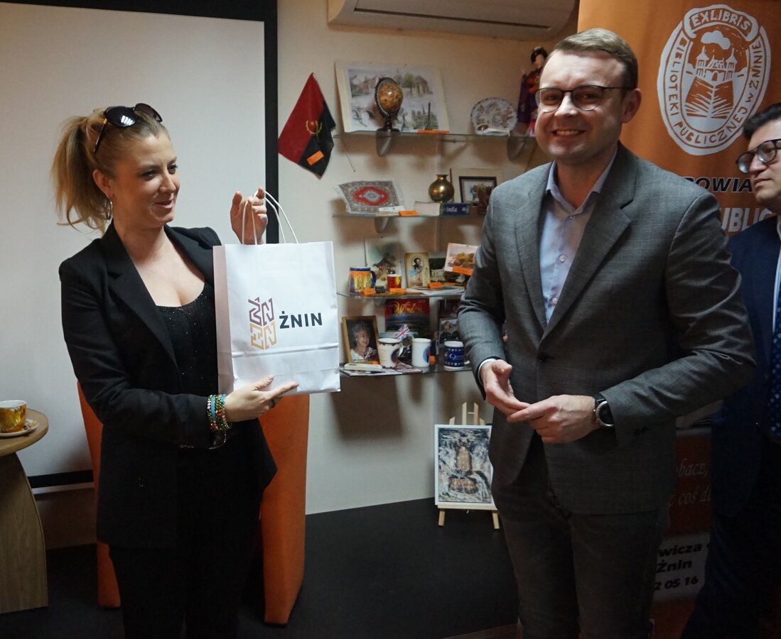 Burmistrz Żnina Łukasz Kwiatkowski oraz Pani Dyrektor biblioteki Beata Czaczyk podziękowali Magdalenie Wolińskiej-Riedi za wspaniałą podróż do Watykanu i Rzymu.