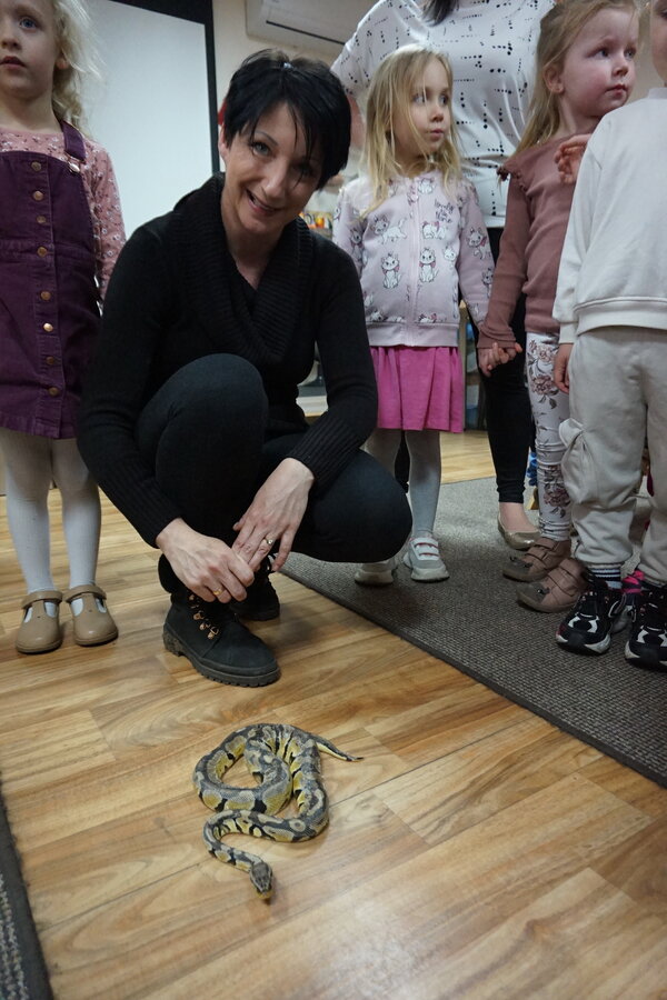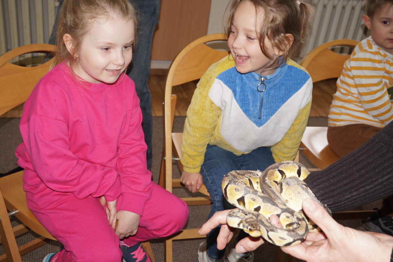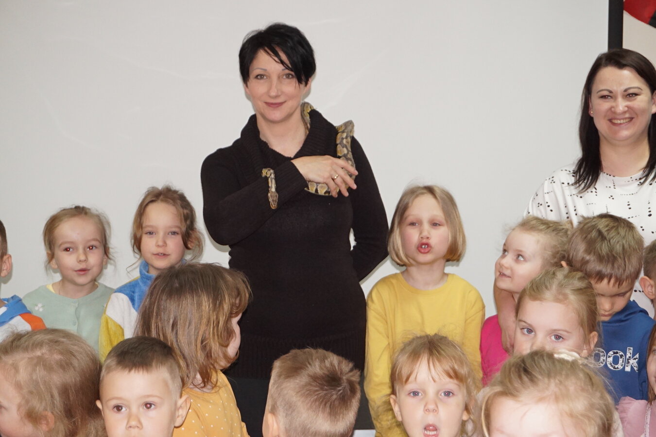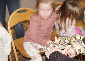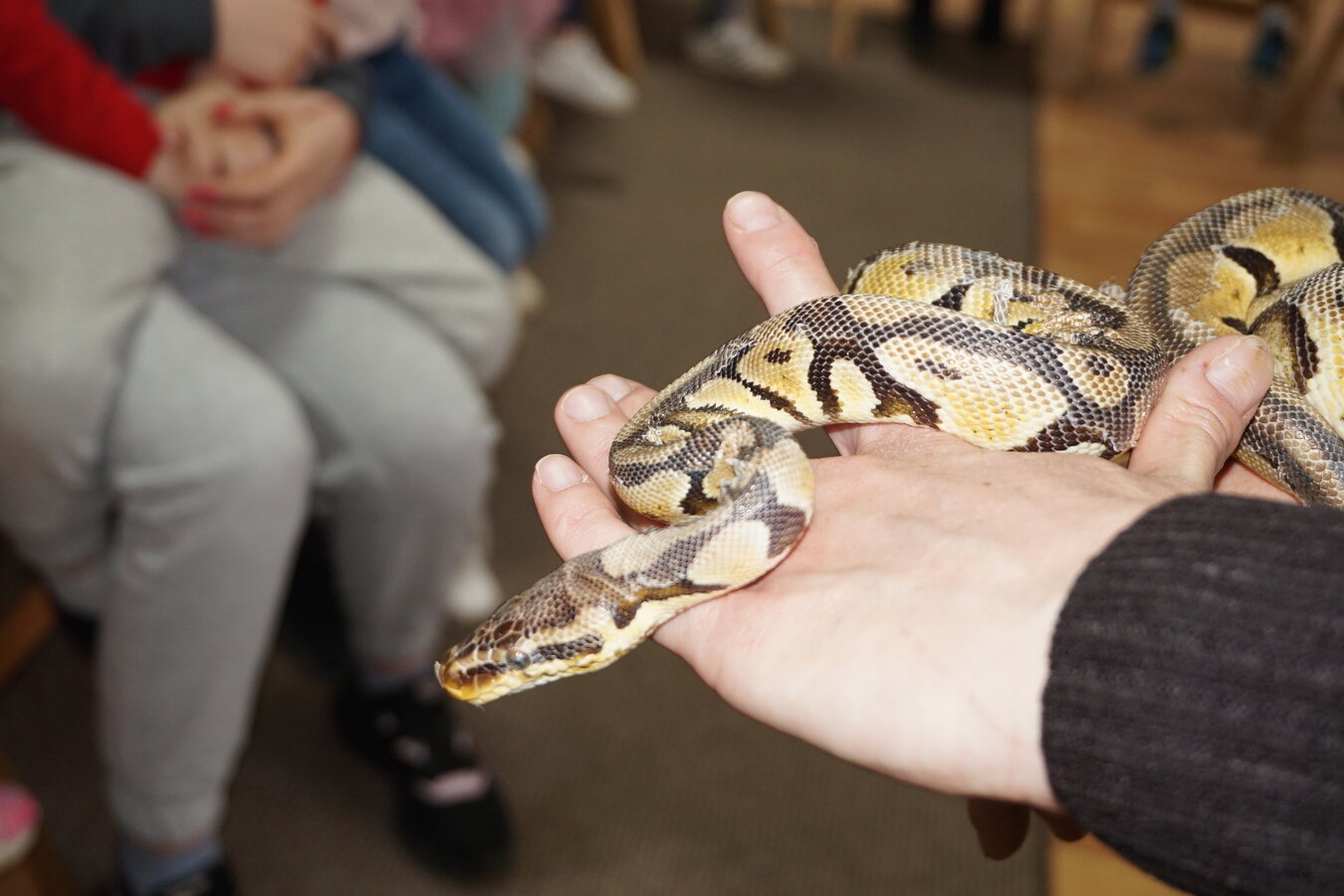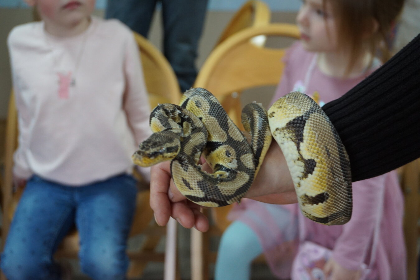 Tym razem pani Ania opowiedziała dzieciom o wężach, a gościem spotkania był pyton królewski o imieniu Duduś.