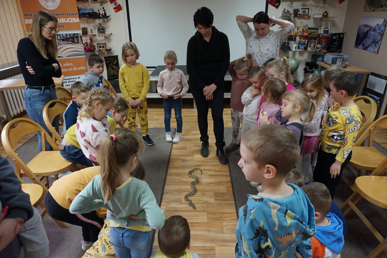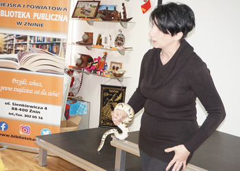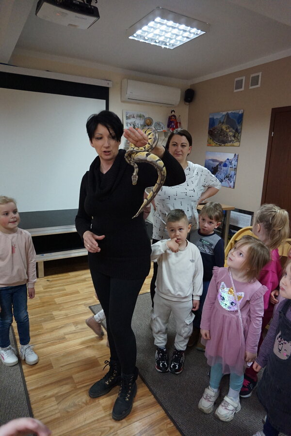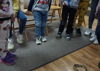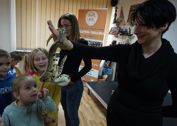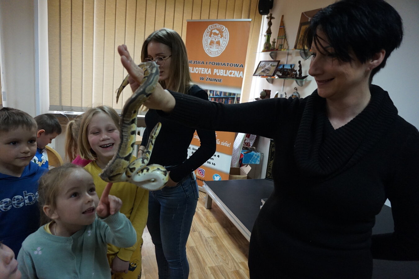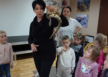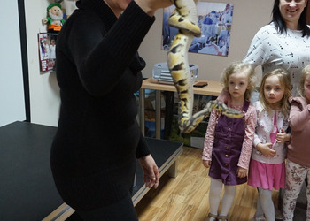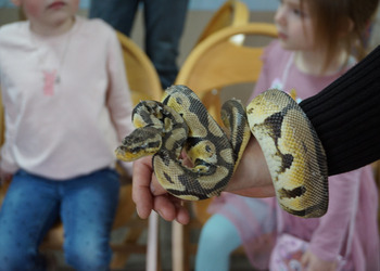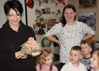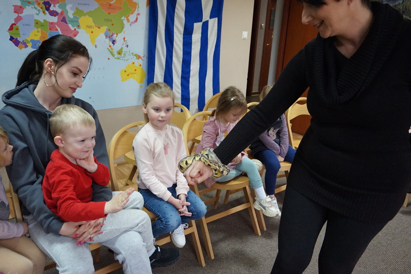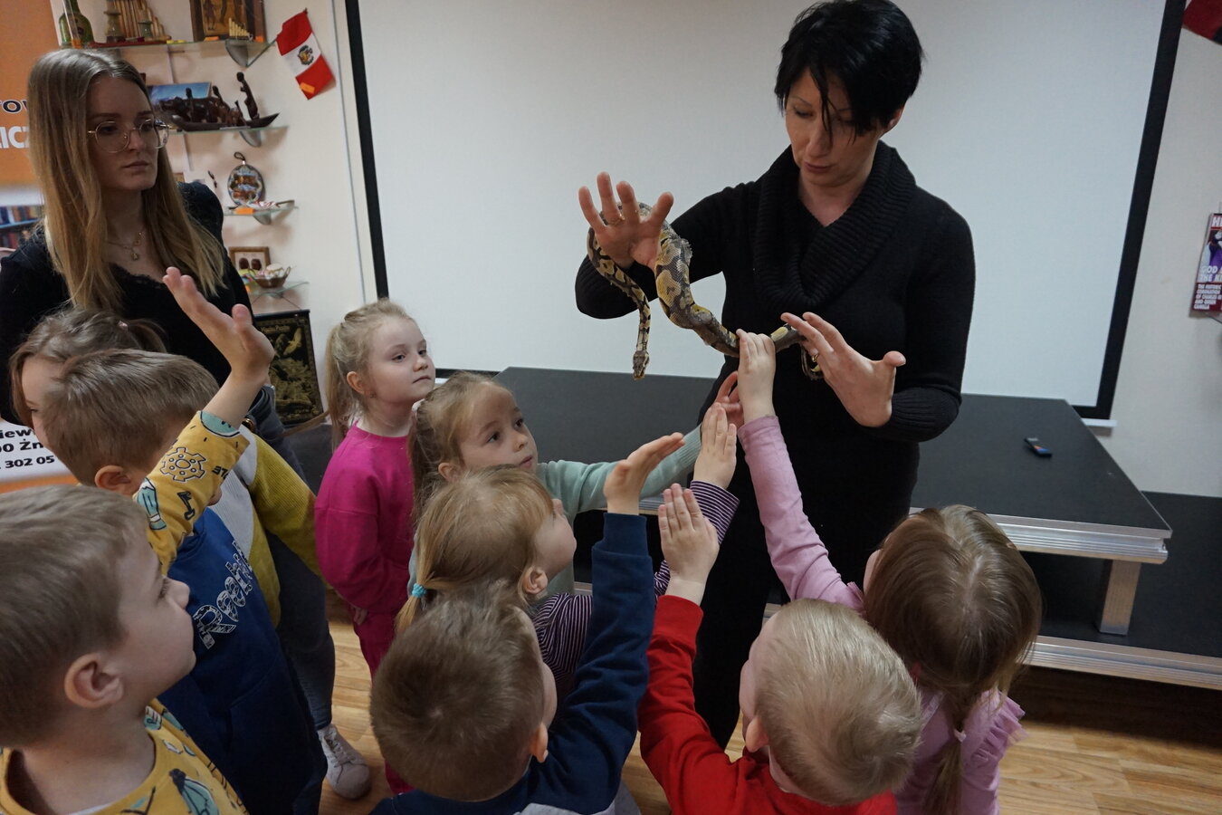 Tym razem pani Ania opowiedziała dzieciom o wężach, a gościem spotkania był pyton królewski o imieniu Duduś.